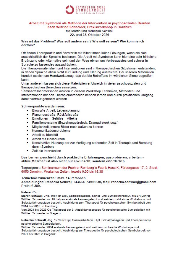 Wir bieten für Menschen in psychoszialen Berufen Workshops an, um die Methode der psychologischen Symbolarbeit als Intervention nach Wilfried Schneider zu lernen.